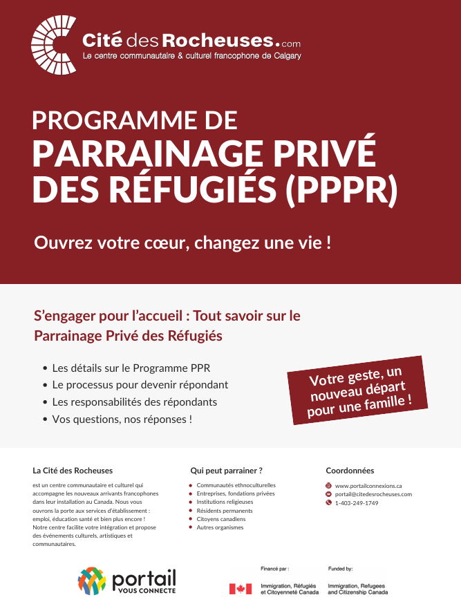 La Cité des Rocheuses accompagne les francophones des Prairies et des Territoires du Nord-Ouest en fournissant toutes les informations, ressources et conseils dont vous avez besoin pour vous impliquer efficacement dans le PPPR. Grâce à nos efforts de promotion, de sensibilisation et de soutien, nous vous permettons de devenir un parrain éclairé et actif, contribuant ainsi à des parrainages inclusifs, positifs et durables pour toutes les personnes réfugiées. Votre engagement peut faire une réelle différence, en aidant des réfugiés à commencer une nouvelle vie dans la dignité et la sécurité, tout en tissant des liens enrichissants avec votre communauté.